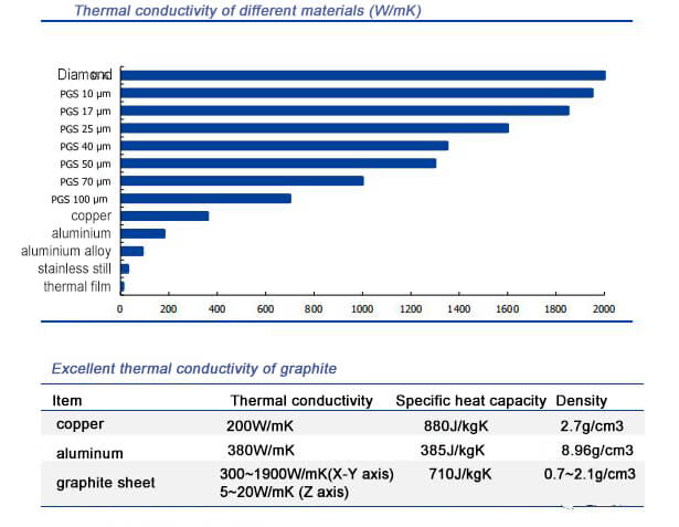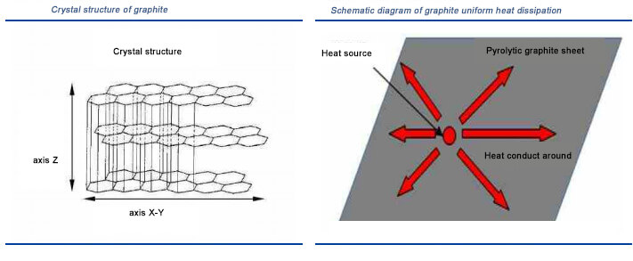 The research found that graphite crystals have a hexagonal planar network structure, which has the characteristics of high temperature resistance, small thermal expansion coefficient, good thermal conductivity, stable chemical properties, and large plasticity. The unique crystal structure of graphite makes its heat transfer mainly concentrated in two directions : XY axis and Z axis. The thermal conductivity of its XY axis is 300 ~ 1,900W / (m · K), while the thermal conductivity of copper and aluminum in the XY direction is only between 200 ~ 400W / (m · K), so Graphite has better heat conduction efficiency and can transfer heat faster. At the same time, the thermal conductivity of graphite in the Z axis is only 5 ~ 20W / (m · K), which almost plays the role of heat insulation. Therefore, graphite has Good soaking effect can effectively prevent local overheating of electronic products. From the perspective of specific heat capacity, the specific heat capacity of graphite is equivalent to that of aluminum, which is about 2 times that of copper, which means that after absorbing the same heat, the graphite temperature rises only by copper. Due to the outstanding properties of graphite in thermal conductivity, it can replace traditional aluminum or copper heat sinks and become an excellent material for heat dissipation solutions.